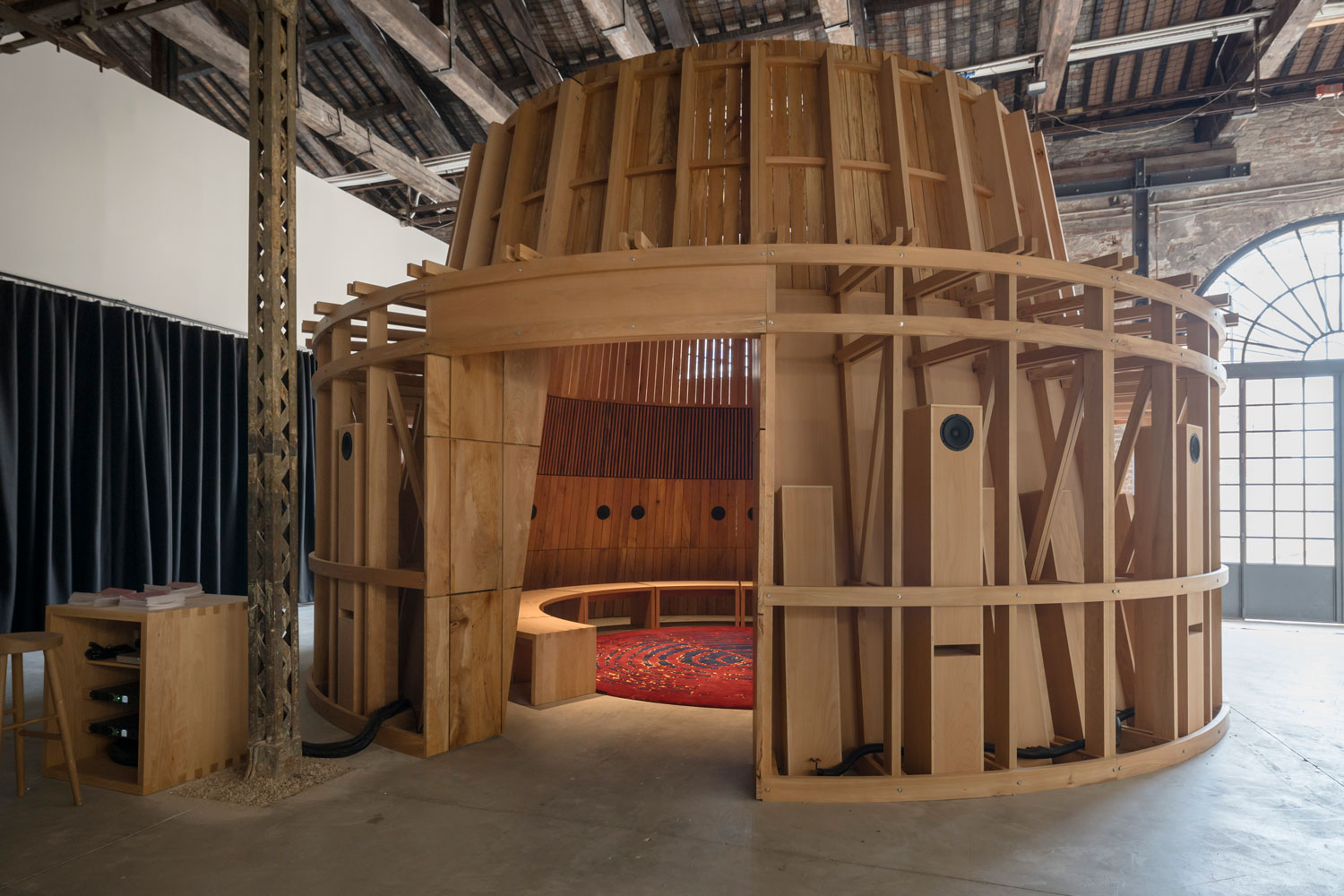 Cork-based architects Louise Cotter and David Naessens have designed a spacious architectural vessel, beautifully crafted in Irish beech by Alan Meredith Studio. Weary Biennale visitors can enter this truncated cone, rest on a segmented bench enclosing a circular rug and listen to sounds of Irish life – from children playing to barely audible crayfish – gathered by composer David Stalling. Other contributors include poet Michelle Delea and art historian Luke Naessens, son of the architects.